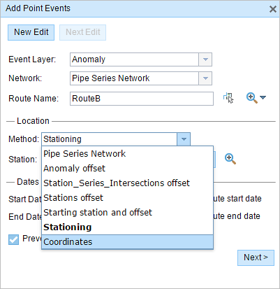 Point events such as anomalies can be represented as a single point event, with the measure information along the route. The Add Point Events widget allows you to create new point events by typing or selecting its x- and y-coordinates on the map.