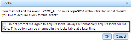 Additionally, conflict prevention prompts can be disabled directly from the message prompt. Check the Do not prompt me again to acquire locks, always automatically acquire locks for me check box when prompted to acquire an event lock and click OK. The event lock is acquired. You will not be prompted to acquire event locks if the lock is available, but Event Editor will continue to alert you if the lock is not available. Conflict prevention prompt settings will persist in your browser's HTML5 storage.