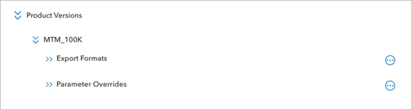 Map products in the Product Versions node with MTM_100K map product expanded to show Export Formats and Parameter Overrides nodes
